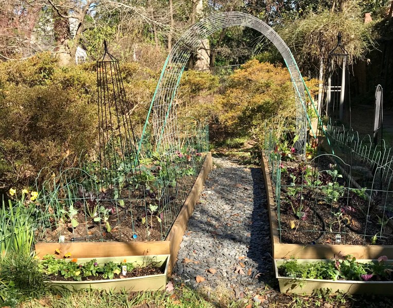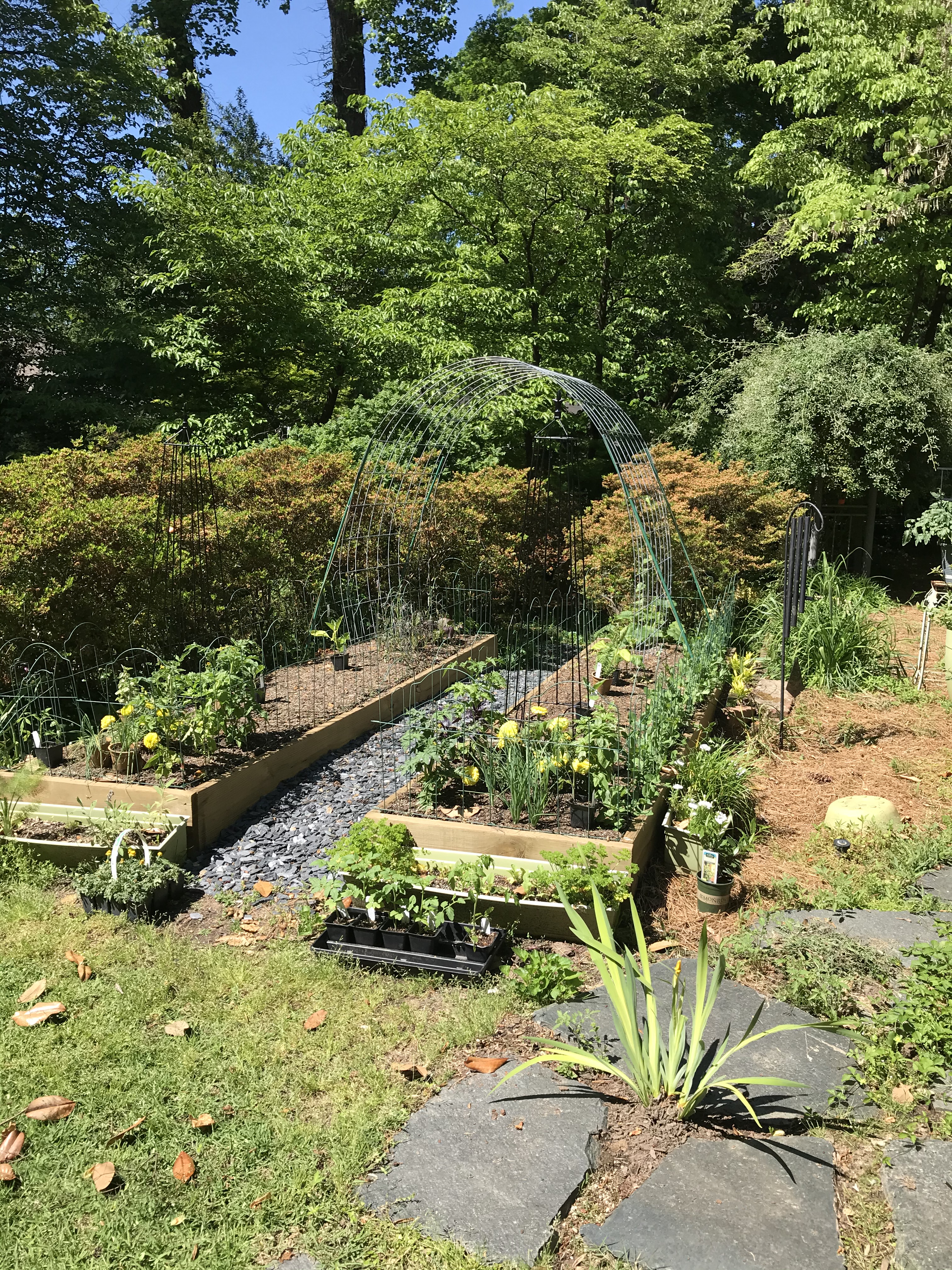 So this spring, we hired a local group that specializes in “edible landcapes”, who removed the temporary beds and the massive stump, and built two long, narrow raised beds with a path between them, and a trellis arch made from cattle fencing to support squash, melons, and maybe some runner beans. Here it is, with only a few plants in place yet: