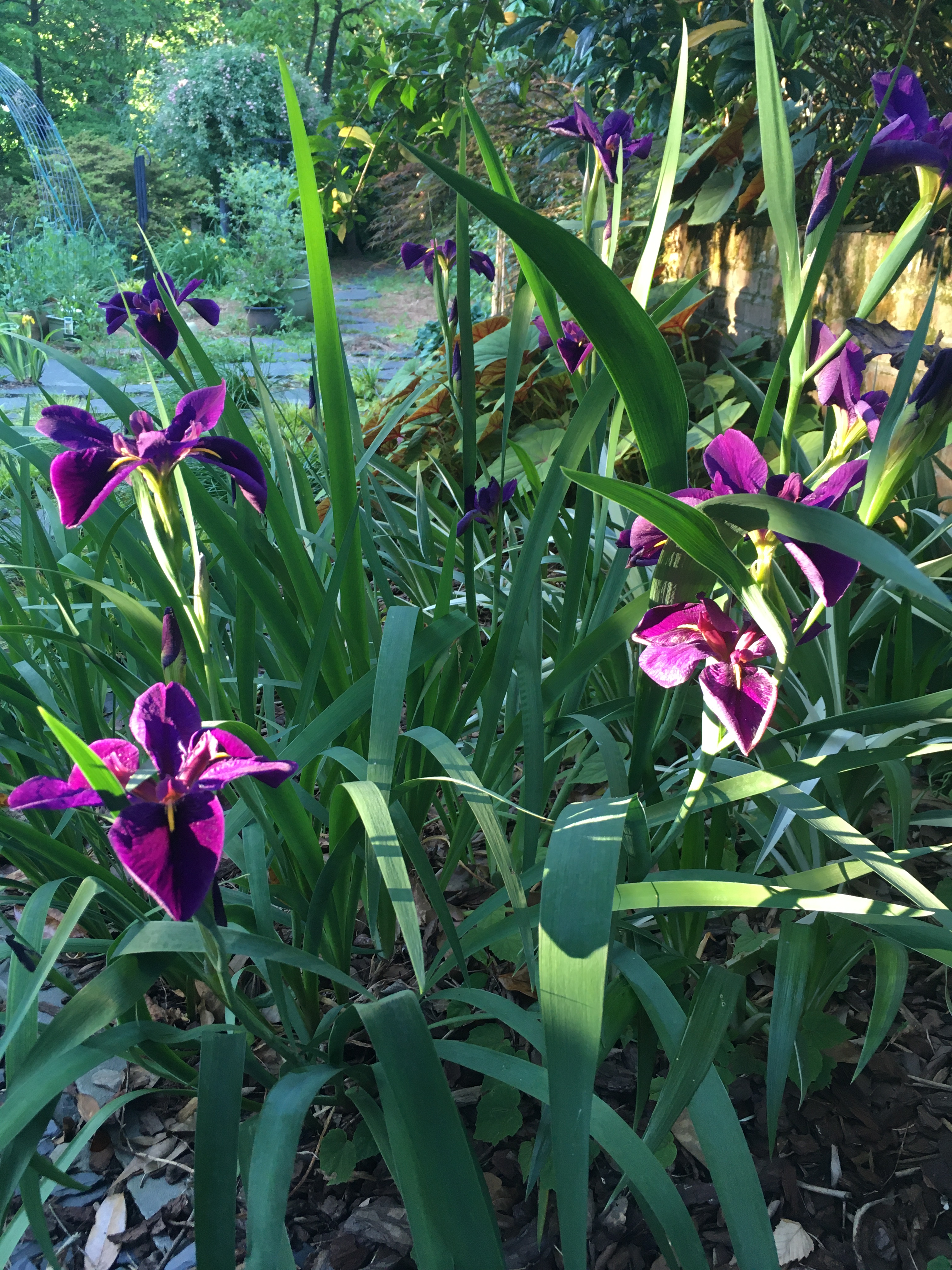 My Saturday Snapshots mostly focus on the vegetable garden, which you can barely see in this photo in the back left corner, but I couldn’t resist sharing this photo of my Louisiana iris in full bloom, with the late afternoon sun lighting them up at a slant.