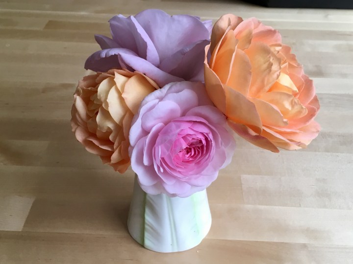 Some early blossoms of David Austin roses from my garden, rescued from a torrential rainstorm. English Roses are so fragrant!