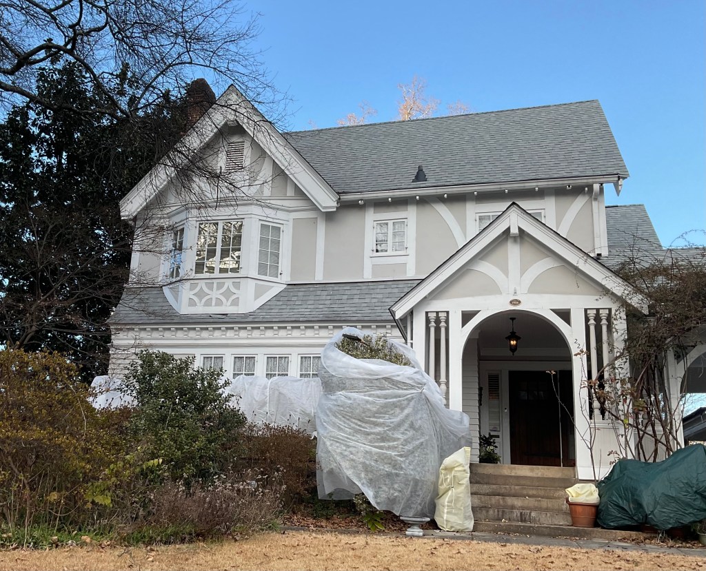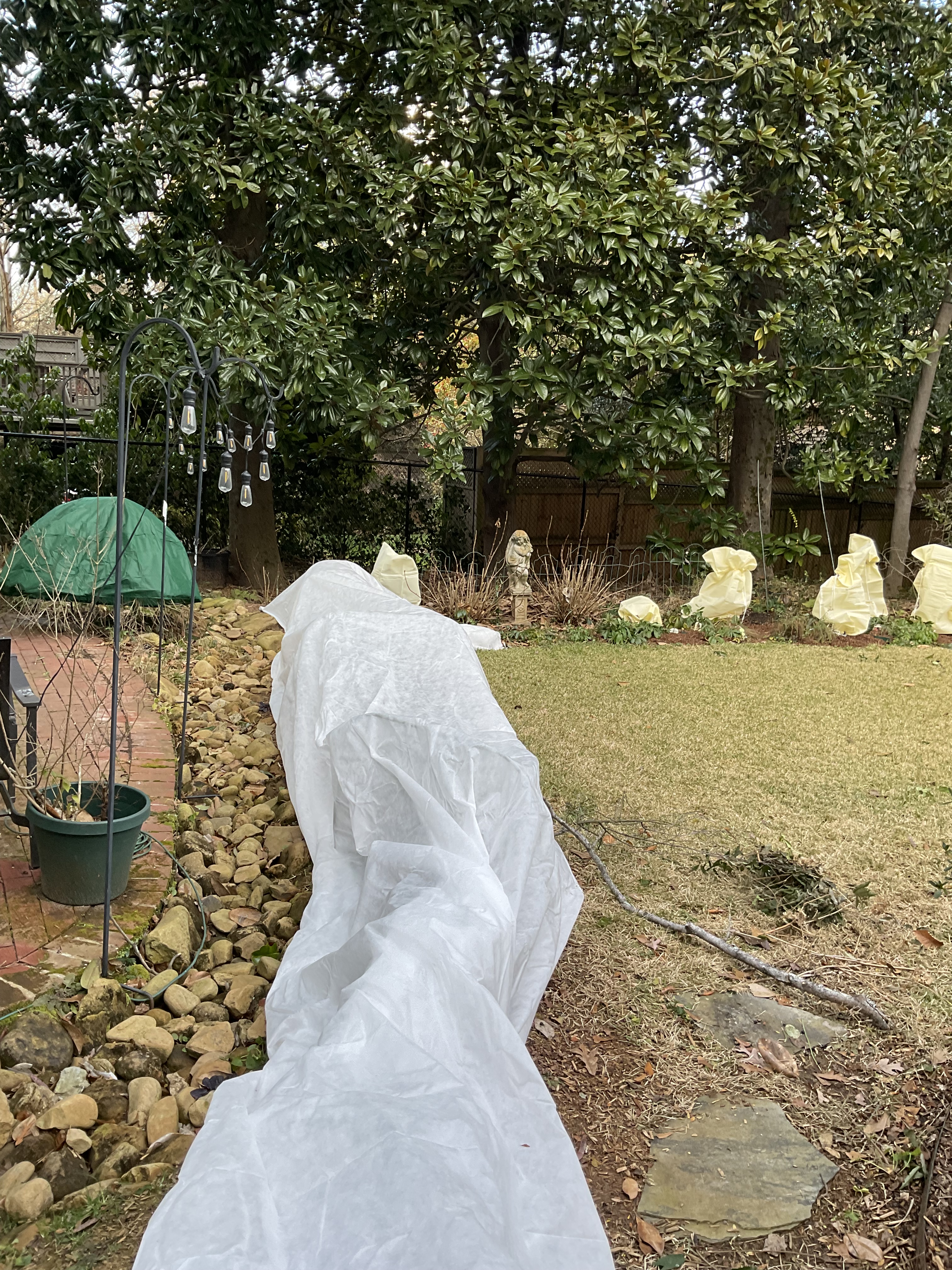 I ordered several frost cloth bags with drawstrings, and those went over the roses I had planted this fall, some in the ground and some in pots. A couple of extra bags went over the still small native azaleas I planted two years ago. A large green frost “planket” was tied down over a cluster of pots with herbs like lavender and sage, and another over a prized Japanese maple. When I shared photos of my work with friends, one of them commented that it looked like a Christo garden, referring to the artist who was famous for his outdoor art installations that involved wrapping of landscape elements.
