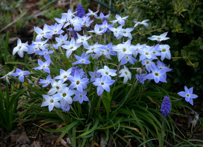 After the new year, any brief spell of sunny weather will coax these leafy clumps into bloom. The flowers are a cheerful pale blue and resemble six-pointed stars. Once they begin to appear, the blossoms continue steadily into March.